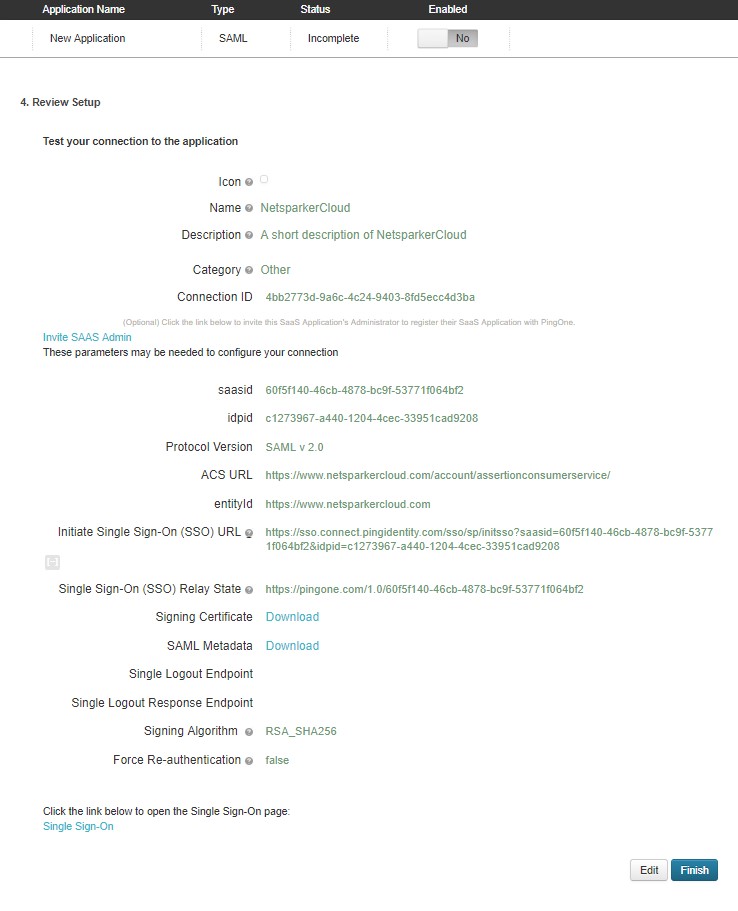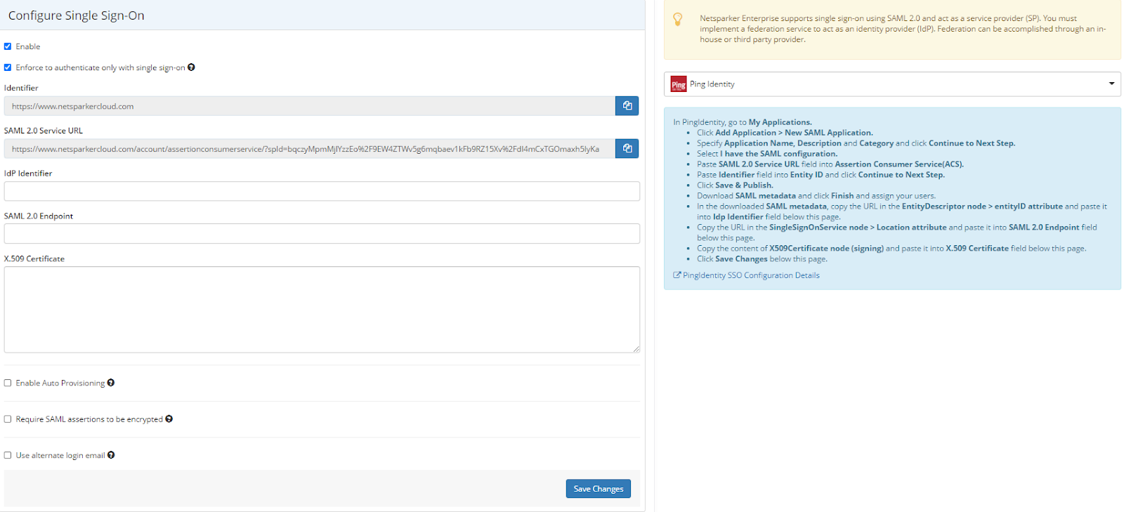 - Then, log in to Netsparker Enterprise, and from the main menu click Settings, then Single Sign-On. The Single Sign-On window is displayed. Select Ping Identity from the drop-down list, and paste the URL into the Idp Identifier field.