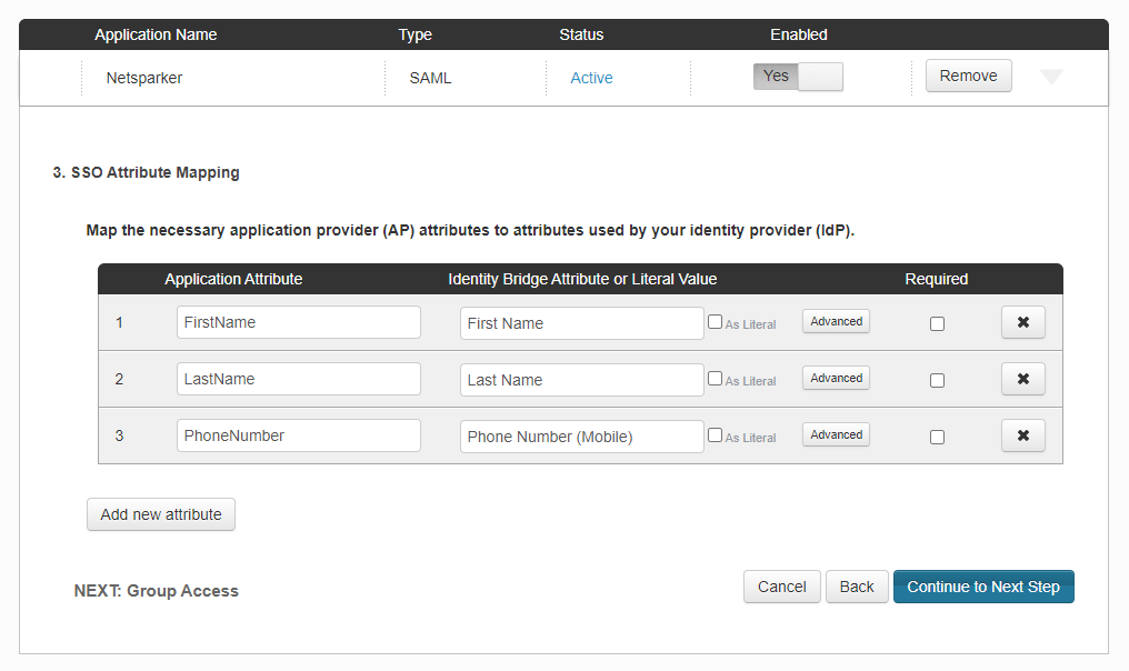 - Click Continue to Next Step. The SSO Attribute Mapping window is displayed.